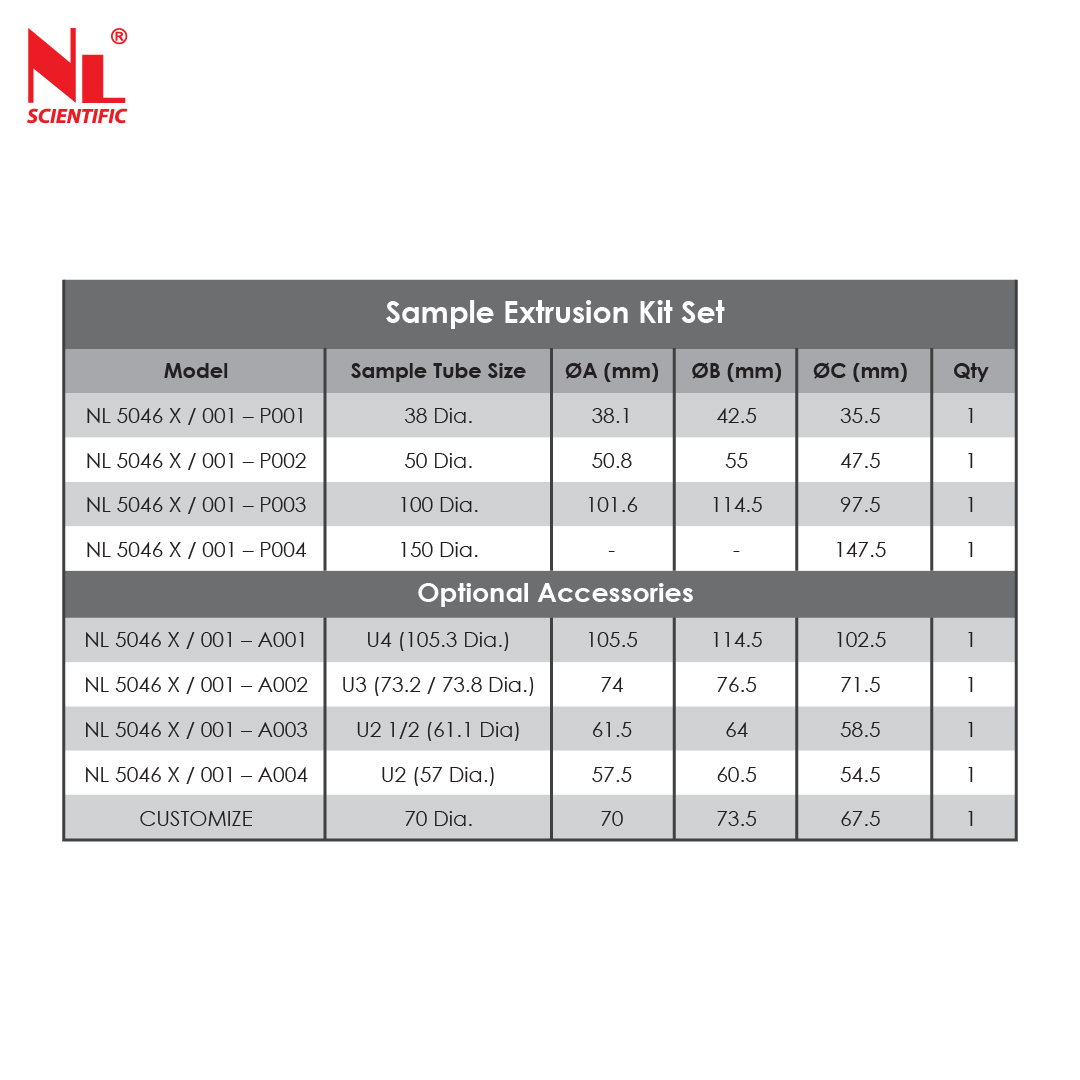 The hand operated unit extrudes samples from Ø 38 to Ø 150 mm with maximum stroke of 650 mm.