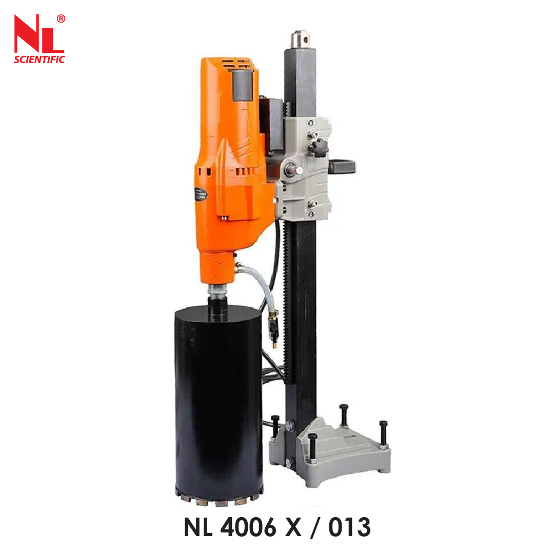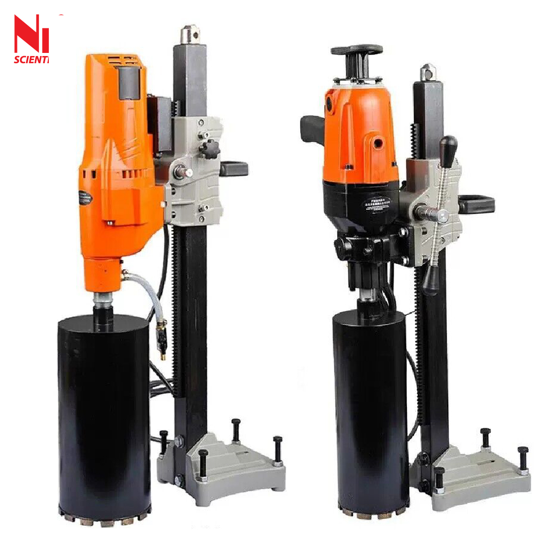 This electrical core drilling machine specially used in laboratory and site cutting core sample such as rock or other material. Features include a side guard and a drainage water outlet. A clamp provided to firmly secure the material during the cutting cycle, a sliding front allows access to the specimen clamp. The motor incorporated a water swivel to cool the diamond bit.