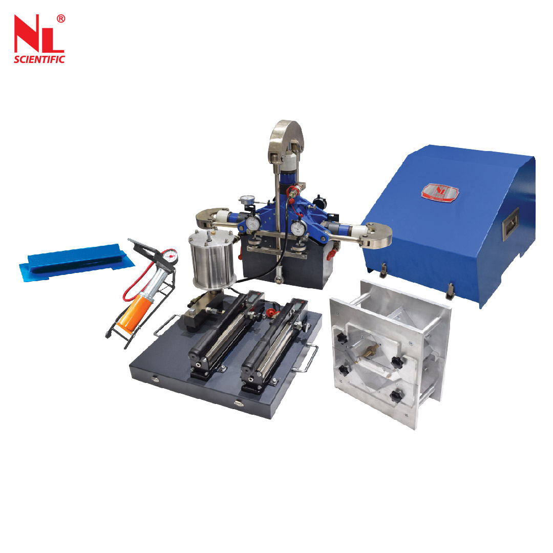 This shear box has been designed to receive irregularly shaped samples with surfaces measuring up to 115 x 125 mm or cores with a maximum diameter of 102 mm. The lower half of the box is connected to two hydraulic rams which generate the shearing force (in both directions) and the upper half supports the ram that applies the load at a right angle to the failure surface. The horizontal and vertical actuators are connected to two manually-operated hydraulic pumps. During the test the normal stress and the shearing stress are read on two independent dial gauges calibrated in engineering units; if the measurement of the shear deformation is required an appropriate dial gauge can be mounted on the support.