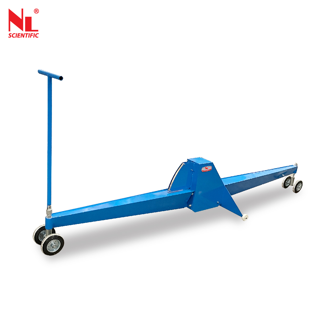 This apparatus is designed to measure road surface irregularities (such as bumps, depressions or unevenness) on both concrete and asphalt pavements. It consists of a rigid beam supported by two fixed wheels at the ends and a central measuring wheel that detects vertical deviations from a straight reference line between the endpoints. As the device moves along the pavement, the central wheel indicates any vertical displacement, providing data on surface smoothness.