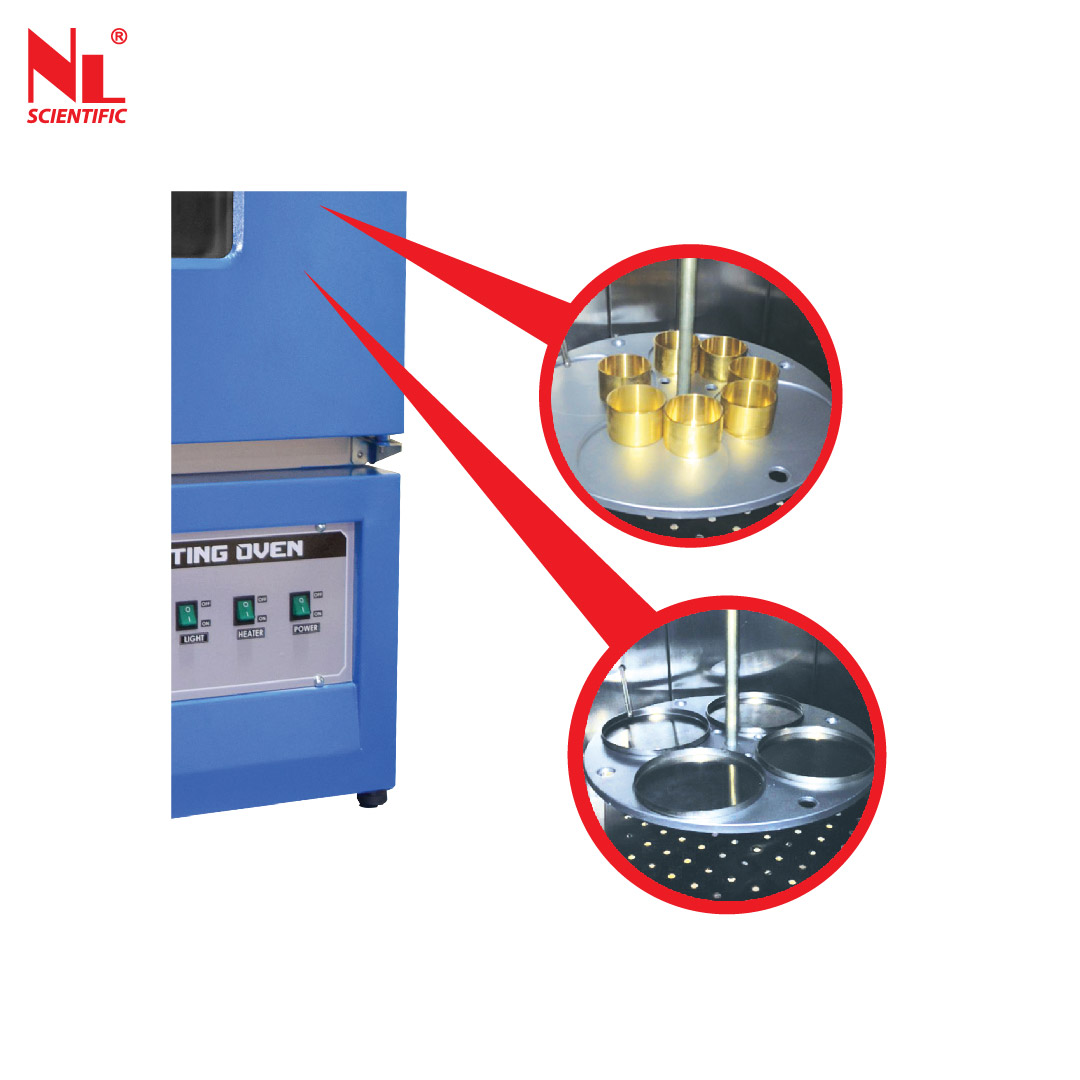 Used for determining the loss in mass of oil and bituminous and the effect of heat and air on a film of semisolid bituminous material . Internal chamber are fully stainless steel with thick isolated fibreglass. External casing coated with hard wearing paint & having glass viewing door.