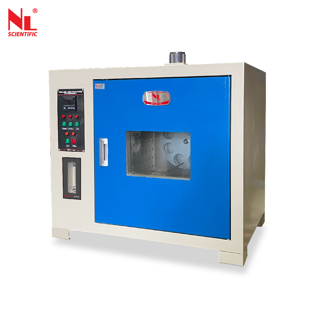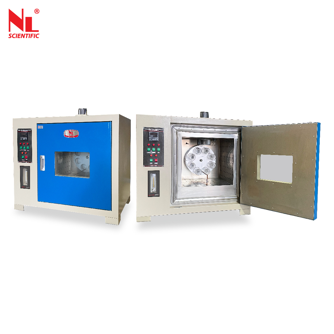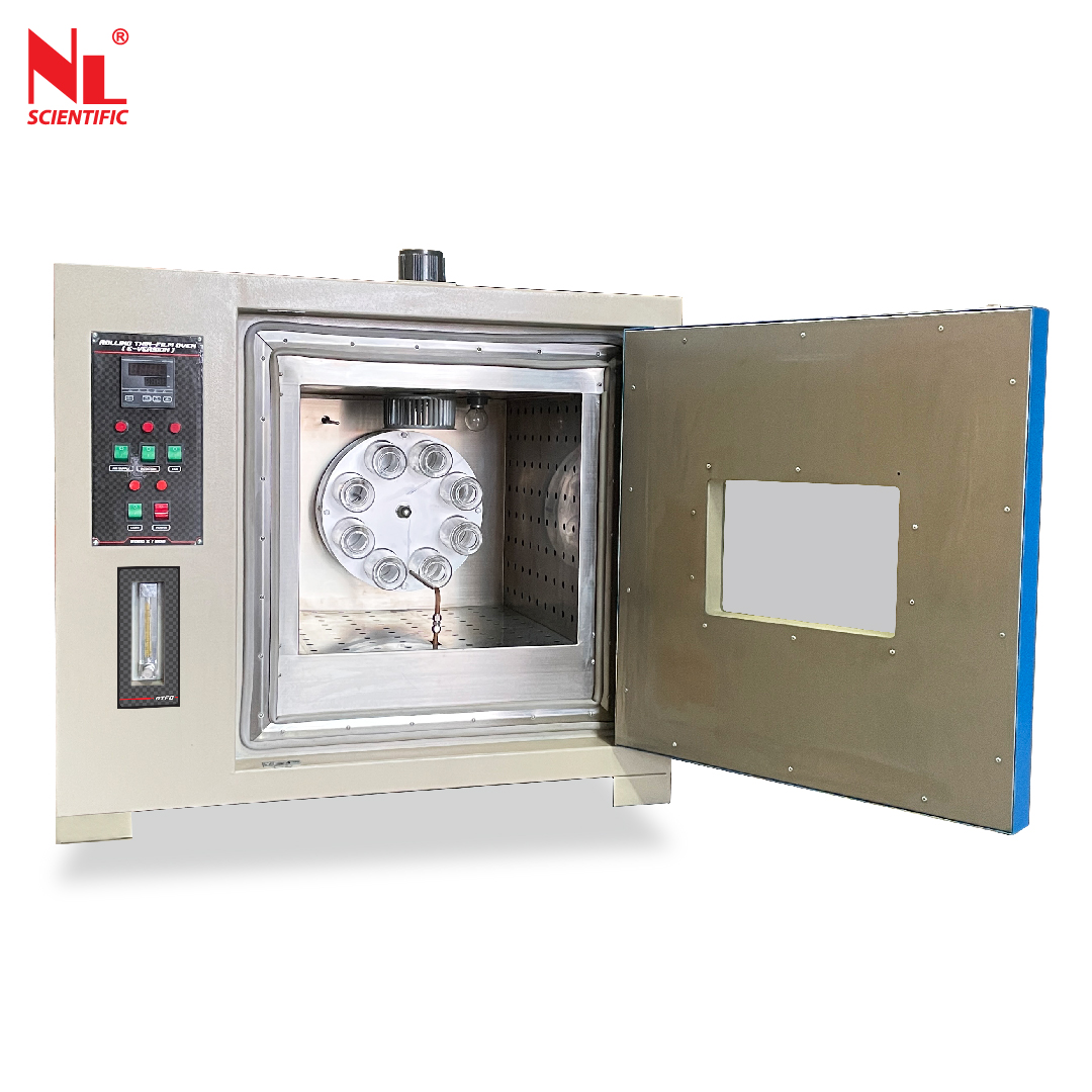 Used for measuring the effect of heat and air on a moving firm of semisolid bituminous material.