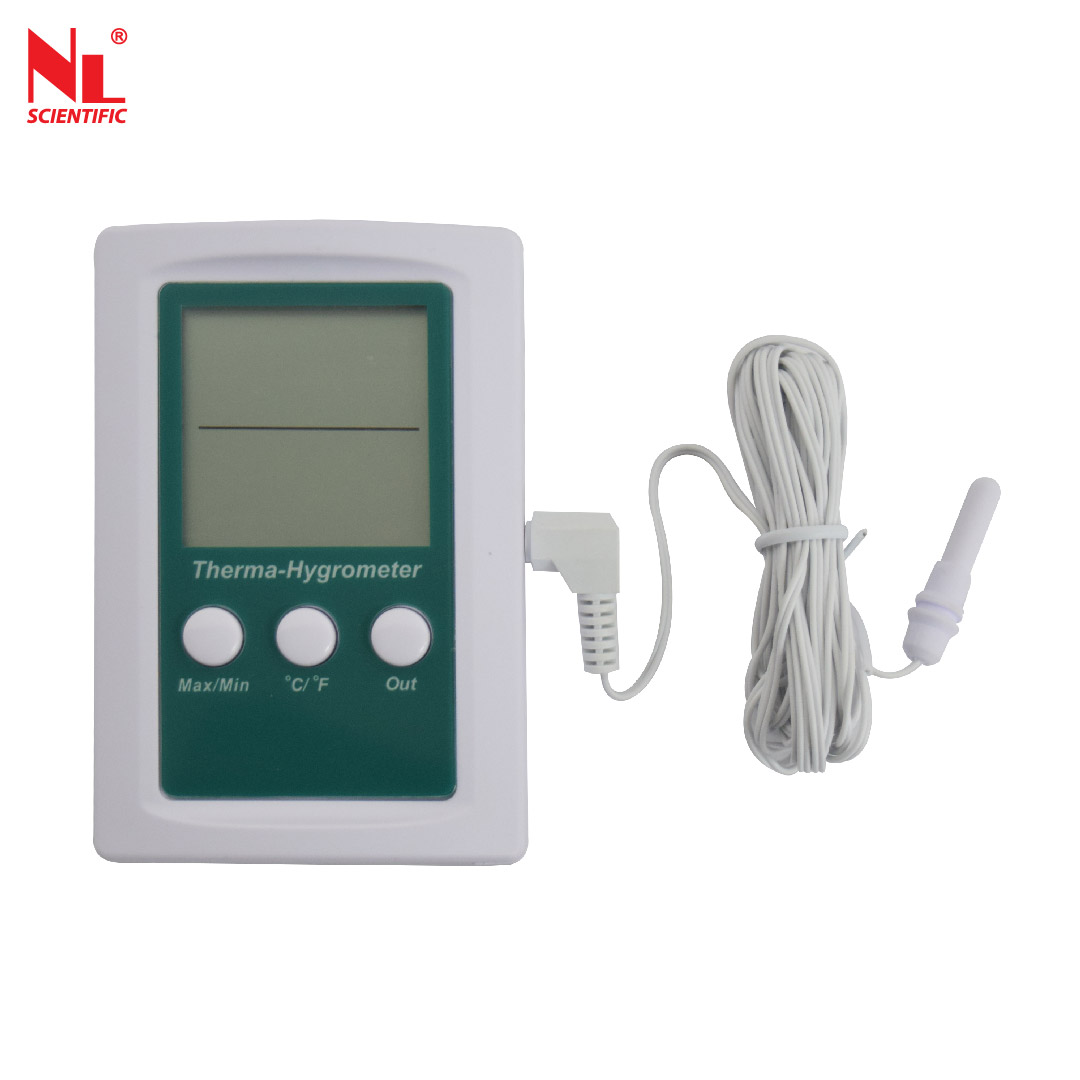 This therma-hygrometer indicates and records the maximum and minimum readings while also displaying the humidity and temperature simultaneously. Using internal sensors, the therma-hygrometer monitors both humidity and temperature across a range of 0 to 49.9°C and 20 to 99 percent relative humidity. The temperature range is extended to -49.9 to 69.9°C by using the external temperature sensor. The therma-hygrometer features a temperature alert alarm that will sound when the external remote temperature probe indicates the temperature is 0°C or below. This feature is ideal for frost/freeze alert in horticulture and similar.