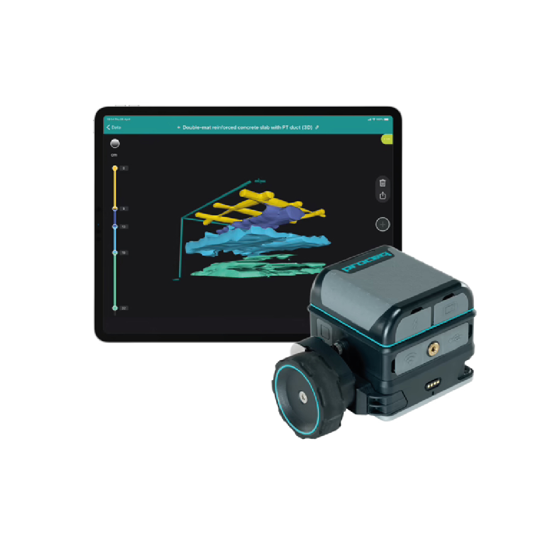 The Proceq GP8800 Ground Penetrating Radar (GPR) system designed for efficient and non-destructive subsurface inspections. Perfect for evaluating concrete structures like buildings, bridges, and roads, it connects wirelessly to an iPad via secure Wi-Fi, making it easy to use without the need for cables. The system utilizes advanced antenna technology, offering high-resolution imaging and depth penetration of up to 65 cm, providing clear insights into the subsurface.